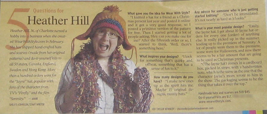 The article about me knitting cunning Jayne hats and other stuff for sale is live. Looks like this is as far as you can go before they make you register. So I’ve scanned it below, and I also have a copy of the whole page as a very nice, very clear pdf.