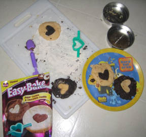 Thank you for the Easy Bake oven, Illiane! We broke it out this evening and made cookies. These cookies, according to the package, contain all kinds of goodies like partially hydrogenated cottonseed oil and pack a whopping 160 calories each.