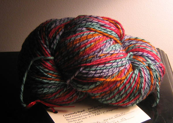 Yarn! At left is 350 yards of hand-dyed goodness from Yarns Forever in Greenville, SC. She sells her stuff online at Creatively Dyed Yarn. I didn’t realize when I bought it that it was self-striping, but I’m actually pleased to know that. I’m anxious to see how this will knit up.