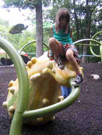 They’ve got a nice playground next to a snack area, set up like a giant garden. There are giant vegetables, spiderwebs made of rope to climb, and thick “vines” to crawl on and through. Emily had fun there. Mostly likely she was thinking about shrink rays. She’s a really “type A” about that whole “take over the world” mission.