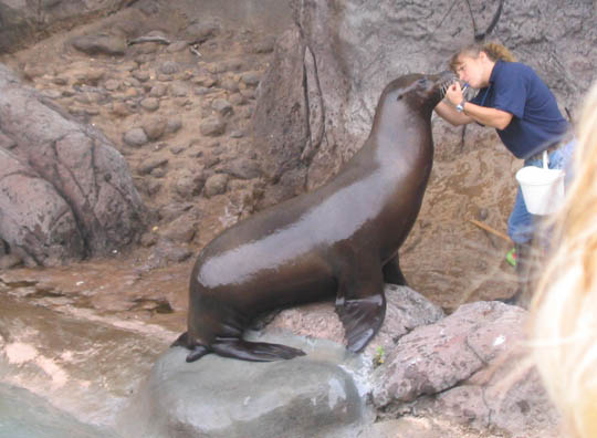 From Australia back to North America. We arrived at the seal and sea lion tank two minutes before feeding time. There was a bit of a press, so I retreated to let the hubby take care of Emily while they watched them get fed. They got to see a few minor tricks as the keepers fed them fish. I didn’t take this picture, but I’ll assume that they were being sure the animals were all healthy as well.