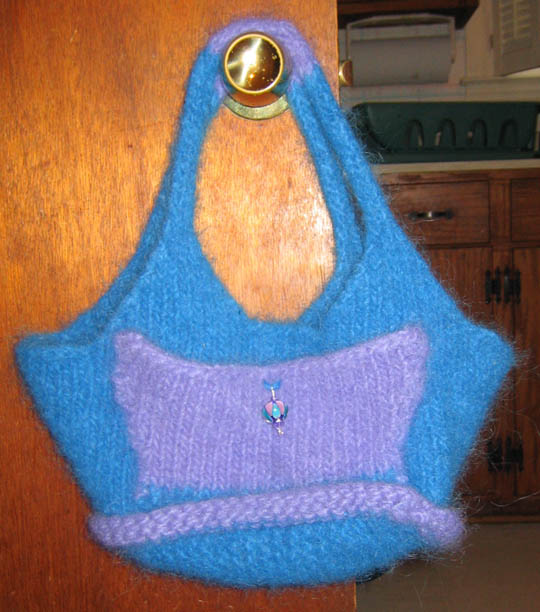 Ceosanna, Tessima, this is how that bag turned out. This pic makes it look a little bigger than it is, I think. I could probably felt it down some more, since it’s still a bit floppy, but I worry that then it will get too small. At this point, my options are to have this be the one I send my niece, or use a different bag pattern and just add a pocket into the design.